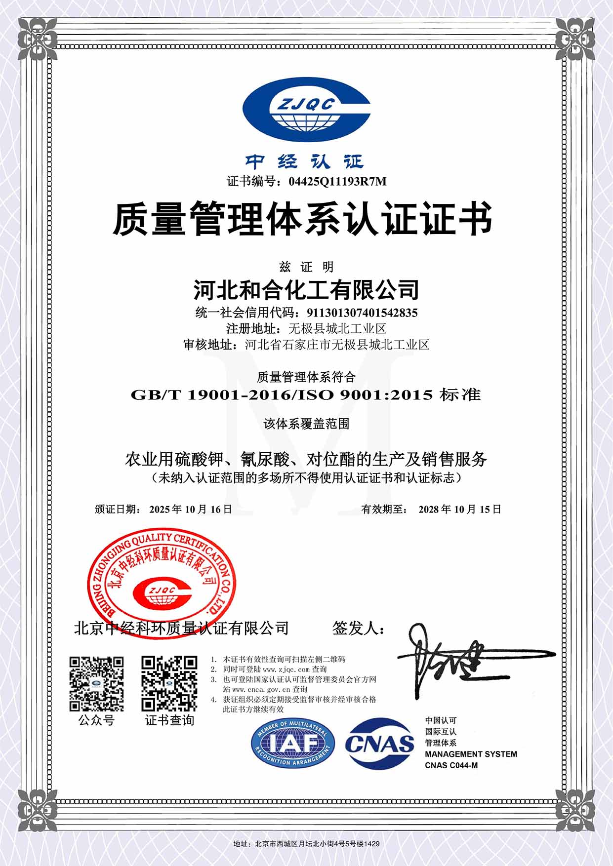 质量管理体系认证证书